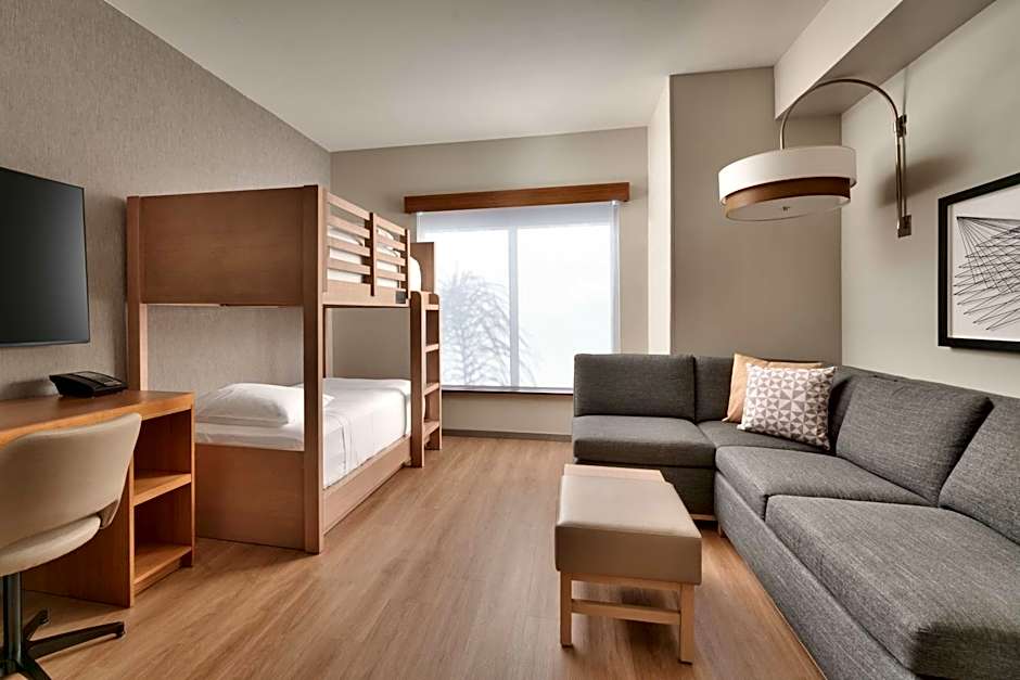 Separated by two French doors, this room includes a sleeping area with one king bed and twin-bed bunk bed.